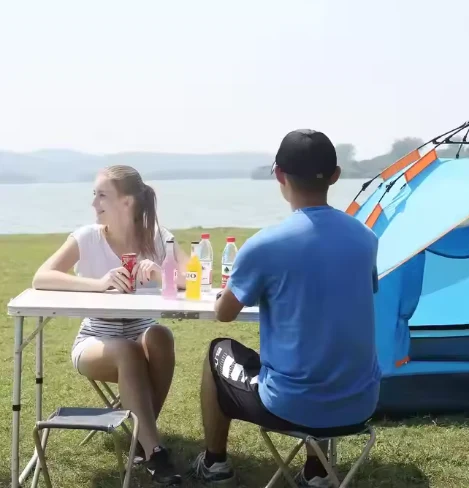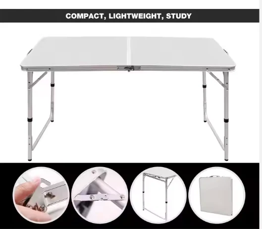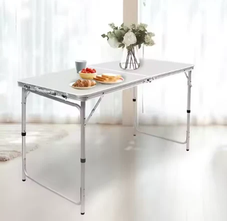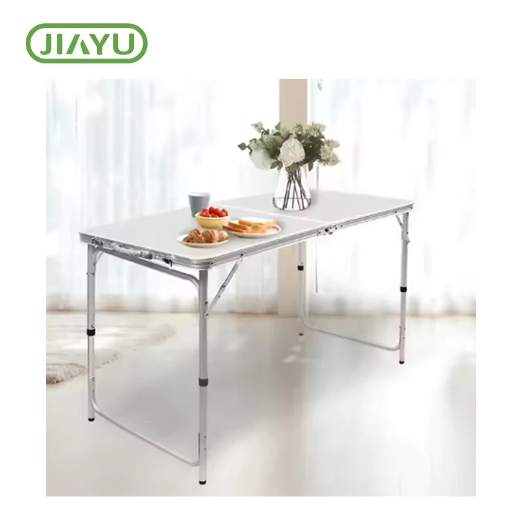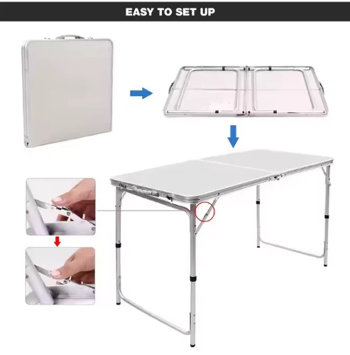 პორტატული დასაკეცი ალუმინის მაგიდა, აქვს მრავალფუნქციური გამოყენებები, როგორც შიდა, ისე გარე, მათ შორის პიკნიკის მაგიდა, პლაჟის მაგიდა და კემპინგი სამზარეულოს მაგიდა, რომლებიც გამოიყენება კემპინგისთვის, სანაპიროზე, ტურიზმში, სპორტულ ღონისძიებებზე, RV გარეთ და თევზაობა.